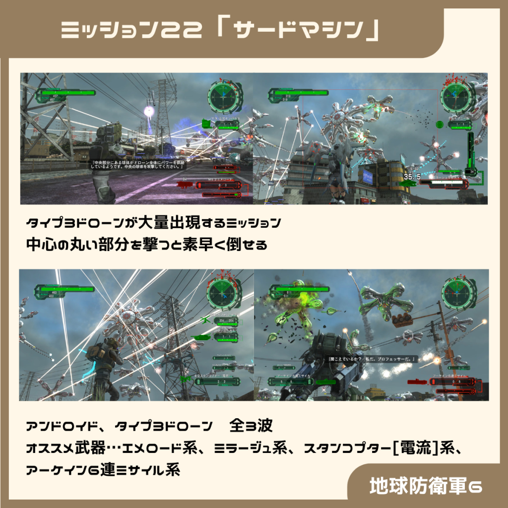 タイプ3ドローンは中央の丸い部分を攻撃すると簡単に倒せるらしいですが、ミッション13で戦った時は知らずに戦っていました…。