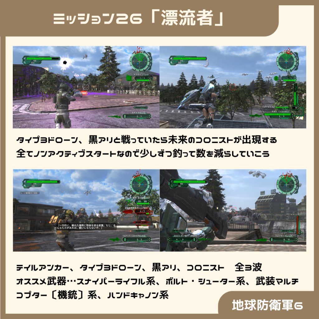 タイプ3ドローンを狙撃すると、近くのドローンや黒アリがアクティブになるので、アクティブになった敵から処理していきましょう。