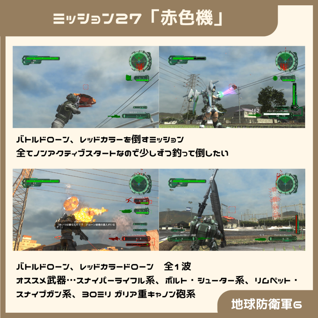 バトルドローンと動きが素早くビームの火力が高いレッドカラードローンの混成部隊を倒すミッションとなっています。