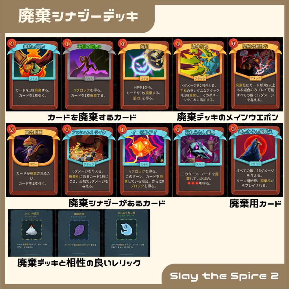 レリックでは「カロンの遺灰(カードを廃棄するたび、すべての敵に3ダメージ)」、「忘れられし魂(手札を廃棄するたびランダムな敵1体に1ダメージ))」がシナジーがあります。