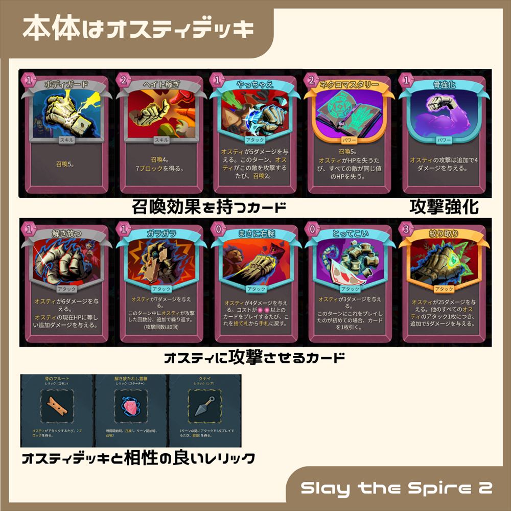オスティはネクロバインダーよりも先に敵の攻撃を受ける盾になり(ダメージを受ける優先順位はブロック → ネスティ →ネクロバインダーの順)、カード能力によってオスティが敵に攻撃を行うこともできます。